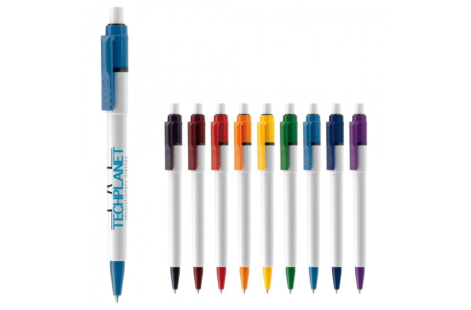 Długopis Baron Colour z białą rurką i przyciskiem z kolorowym klipsem i końcówką. Wkład to syntetyczny wkład Jumbo i zawiera niebieski tusz do pisania. Zawiera mechanizm przycisku i jest wykonany z ABS, produkowany w Europie. Dla zamówień od 5.000 sztuk możesz wybrać własną kombinację kolorów.