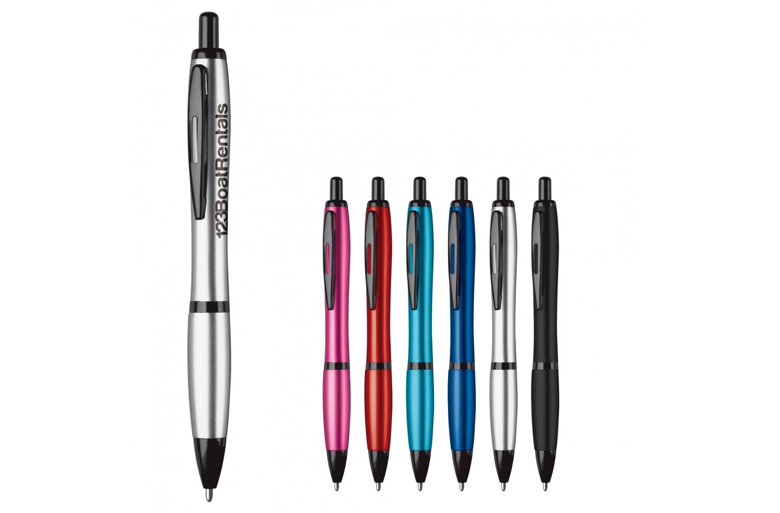 Długopis dostępny w wielu metalicznych kolorach z czarnymi elementami. W standardzie z niebieskim tuszem.