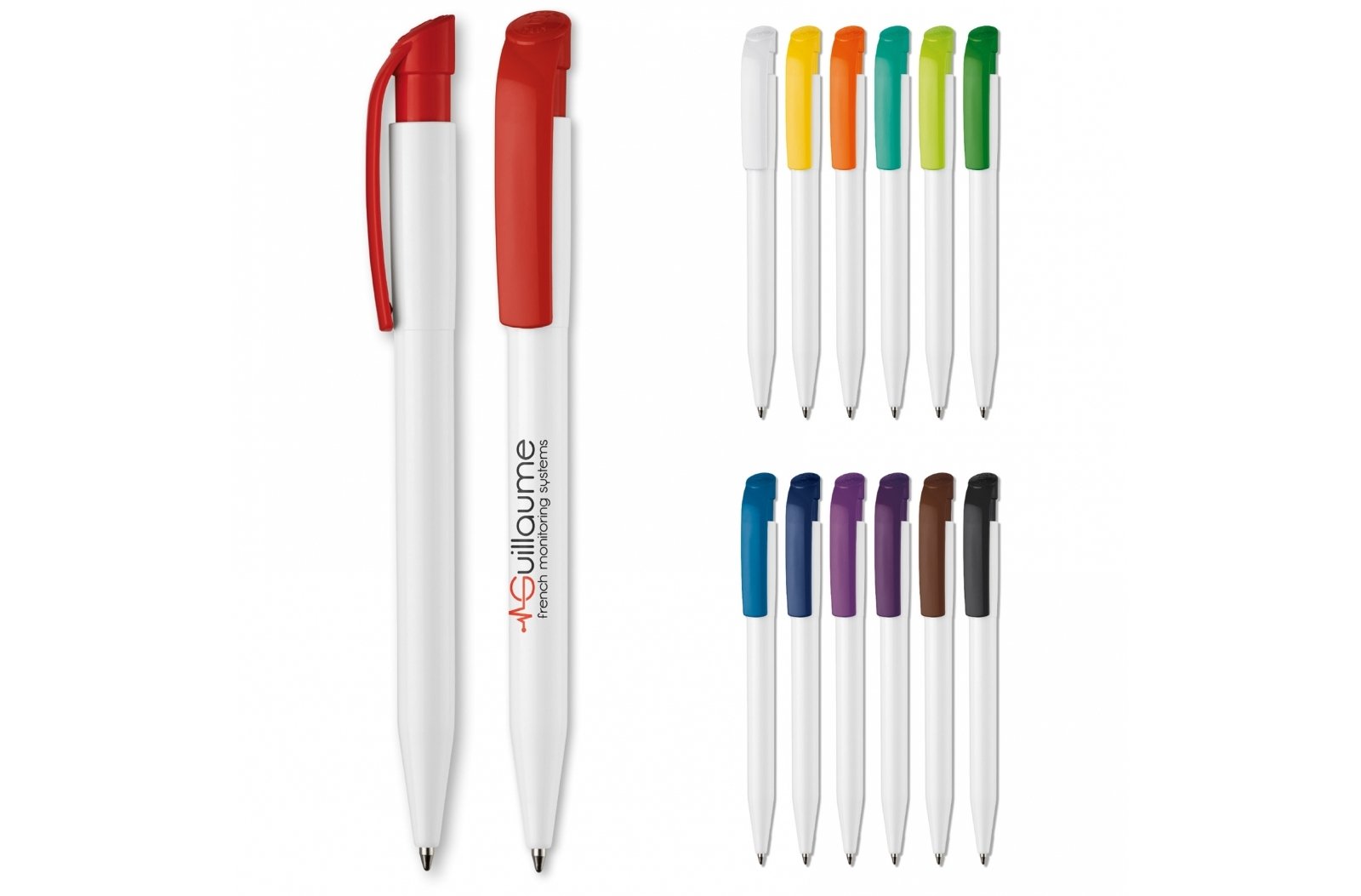 Nowoczesny długopis S45. Z dużą przestrzenią nadrukową, jest to miły element reklamowy. Zawiera mechanizm przycisku i wkład X20 z niebieskim tuszem do pisania. Długopis jest wykonany z ABS i jest produkowany w Europie. Dla zamówień od 5.000 sztuk możesz wybrać własną kombinację kolorów.