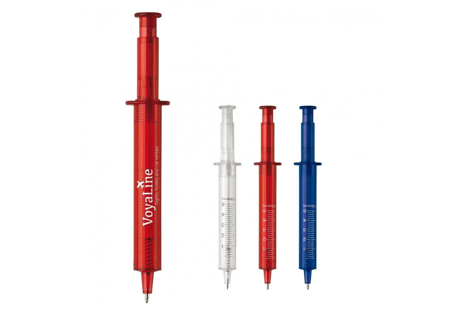 Przezroczysty długopis w kształcie strzykawki dostępny w wielu kolorach.