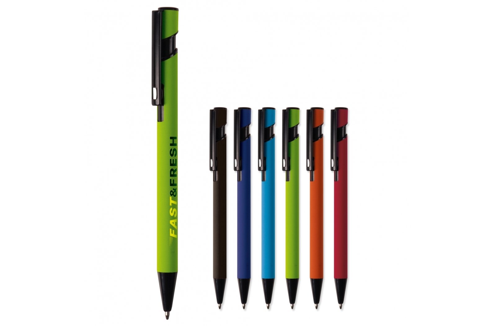 Gumowany, matowy długopis w wielu modnych kolorach z wykończeniem soft-touch. Długopis jest świetnym prezentem biznesowym, metalowe części posiadają czarne wykończenie. Posiada plastikowy niebieski wkład Jumbo.