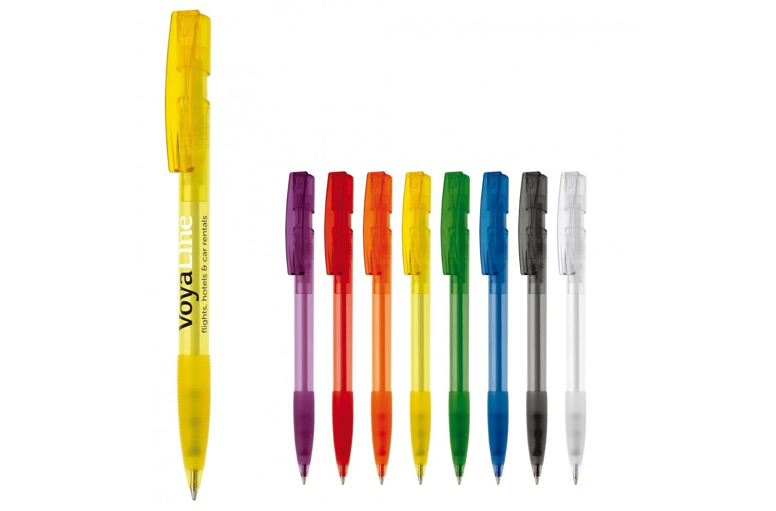 Transparentny długopis Toppoint. Z niebieskim wkładem X-20. Wyprodukowany w Niemczech.