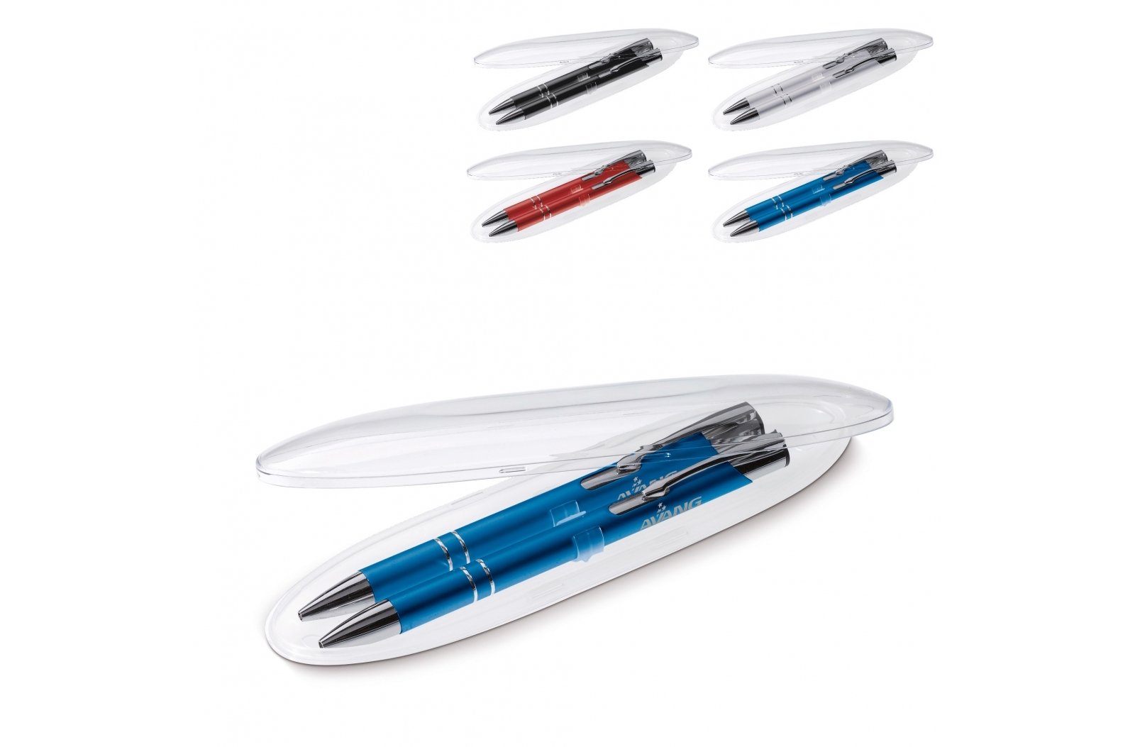 Komplet – długopis Alicante (87915) i ołówek (89216) w owalnym, przezroczystym pudełku upominkowym. Standardowo nadruk na pudełku upominkowym.