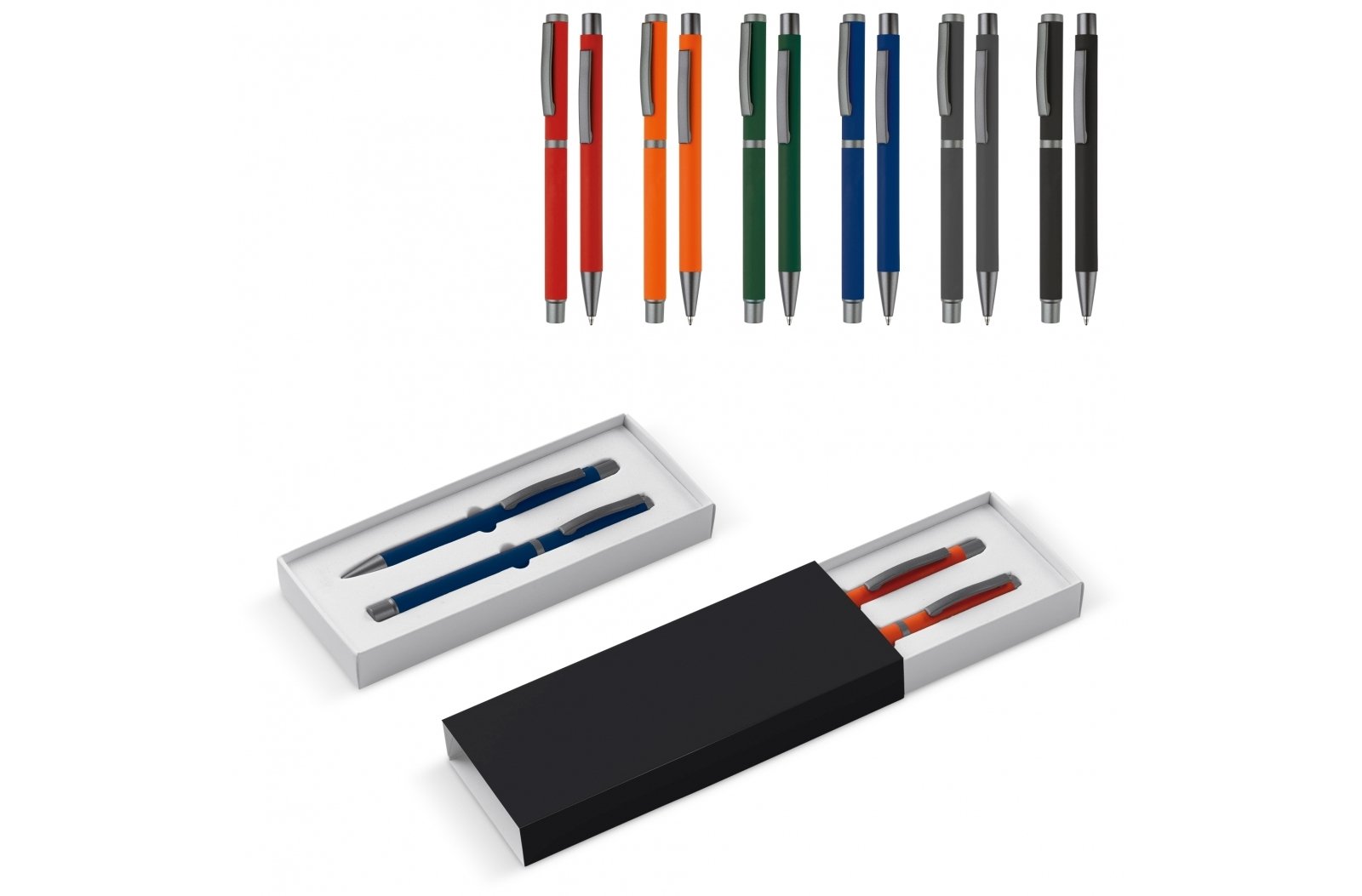 Metalowy zestaw do pisania z długopisem i piórem kulkowym z wykończeniem soft touch. Posiadają solidny metalowy klip. Długopis oraz pióro posiadają niebieski wkład.