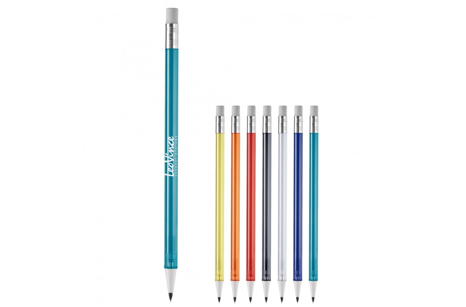 Transparentny, kolorowy ołówek mechaniczny (0,5 mm) z gumką. Łatwy do uzupełnienia.
