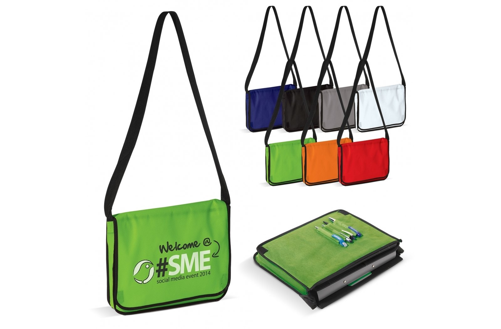 Nowoczesna torba non woven, zakładana na ramię, w kilku stylowych kolorach. Czarny pasek na ramię i kieszonka na 4 długopisy.