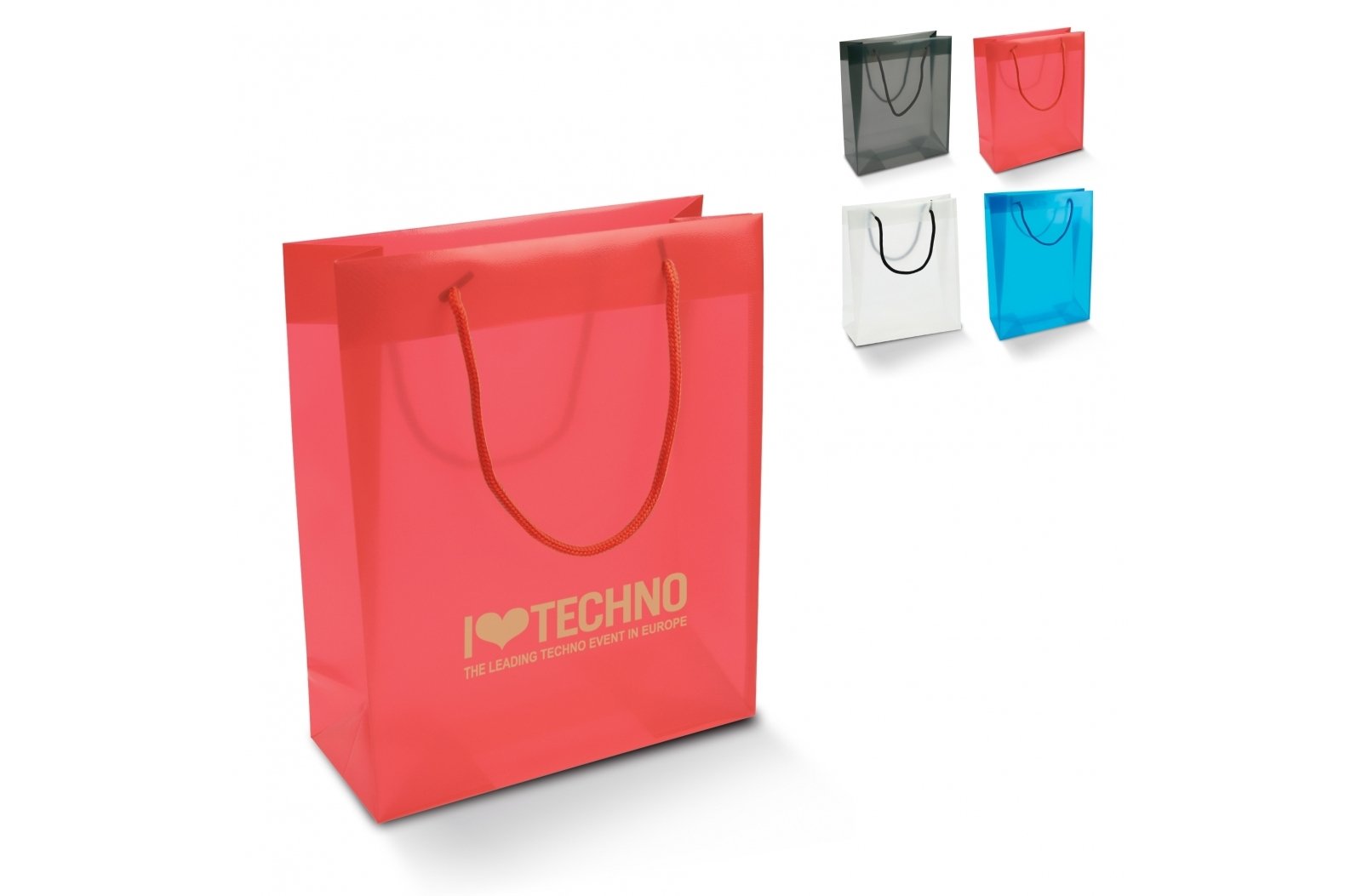 Plastikowa torba wykonana z PP. Transparentna. Idealna na perfumy i podobne artykuły. Średni format. Maksymalnie 1 kolor nadruku na stronie. Nadruk wielokolorowy i inne rozmiary dostępne od 10.000 szt.