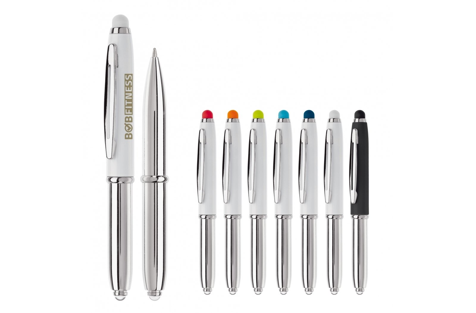 Długopis z dotykowym piórem i latarką. Długopis może być używany po zdjęciu nakrętki. Niebieski wkład.