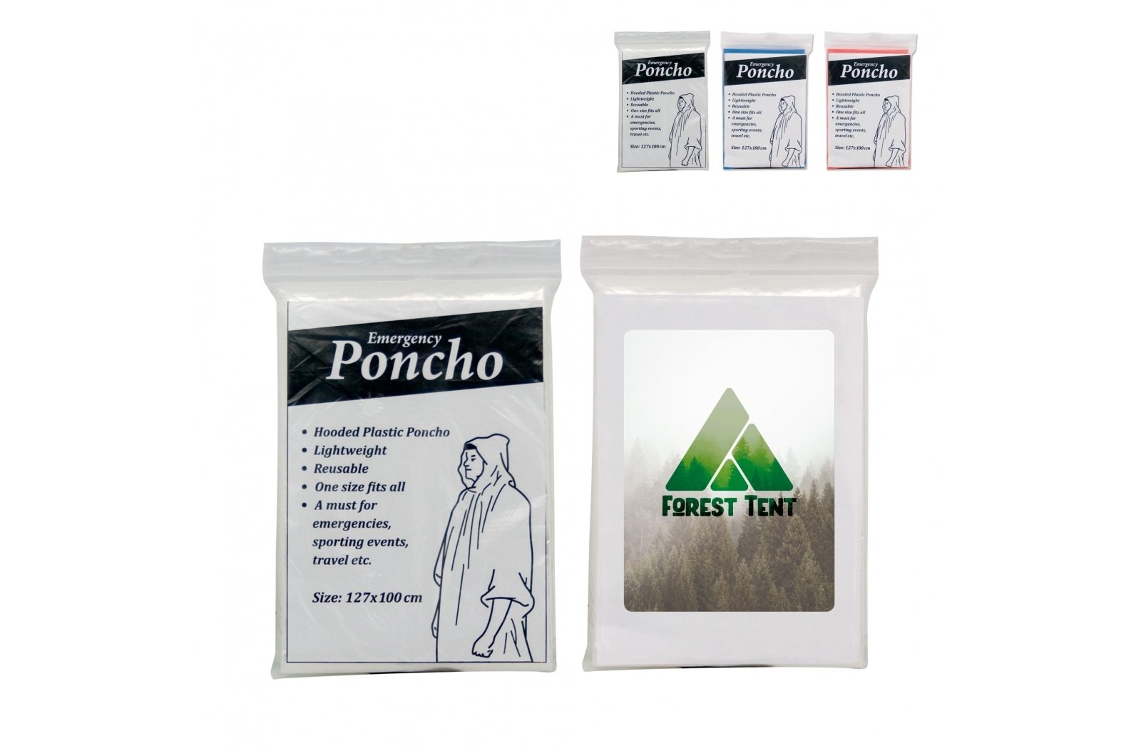Plastikowy płaszcz przeciwdeszczowy z kapturem. Jeden uniwersalny rozmiar. Znakowanie naklejką.