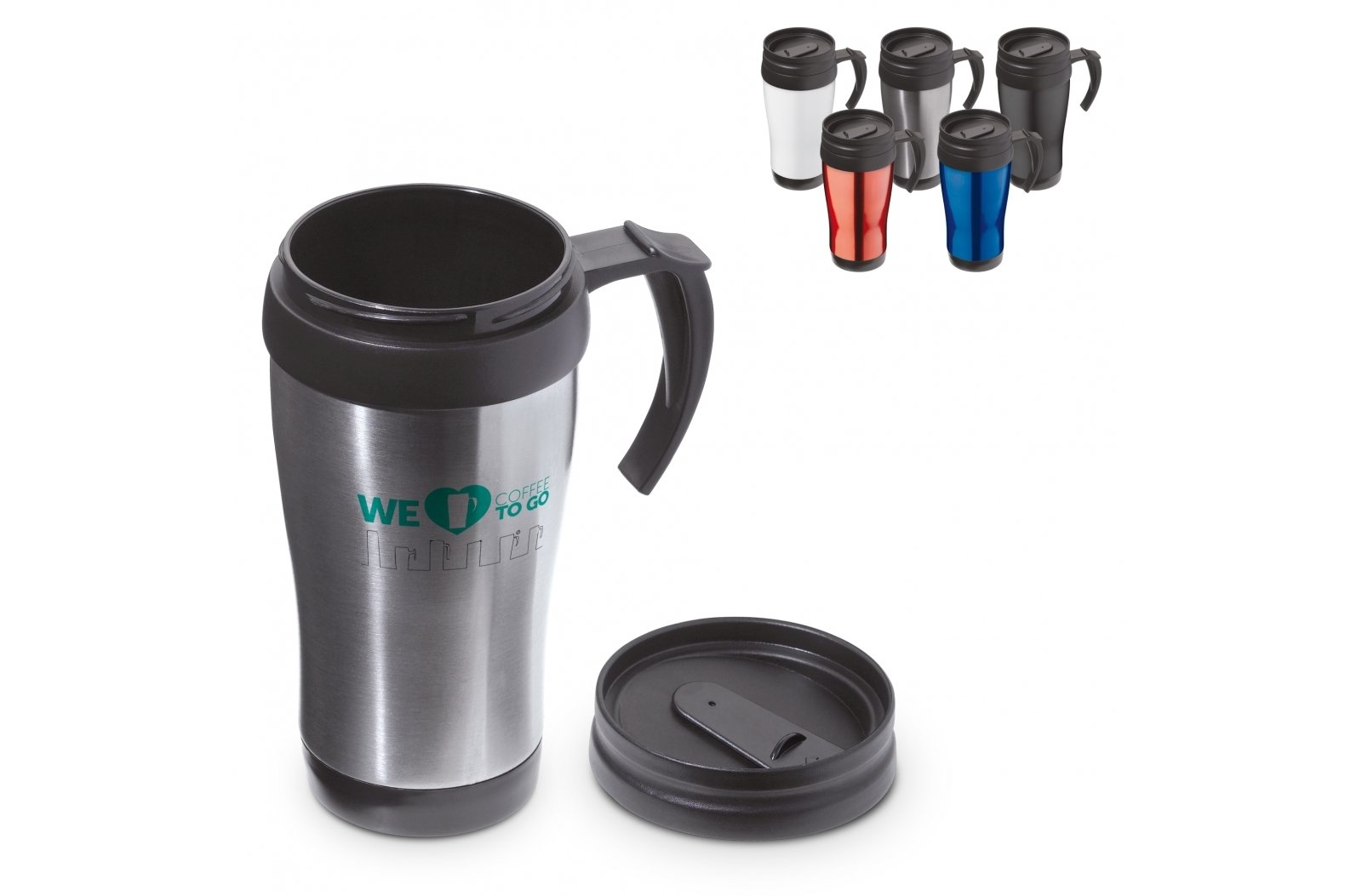 Metalowy kubek termiczny do samochodu, odpowiedni do gorących napojów. Metalowy na zewnątrz, plastikowy w środku. Dostarczany w pudełku.
