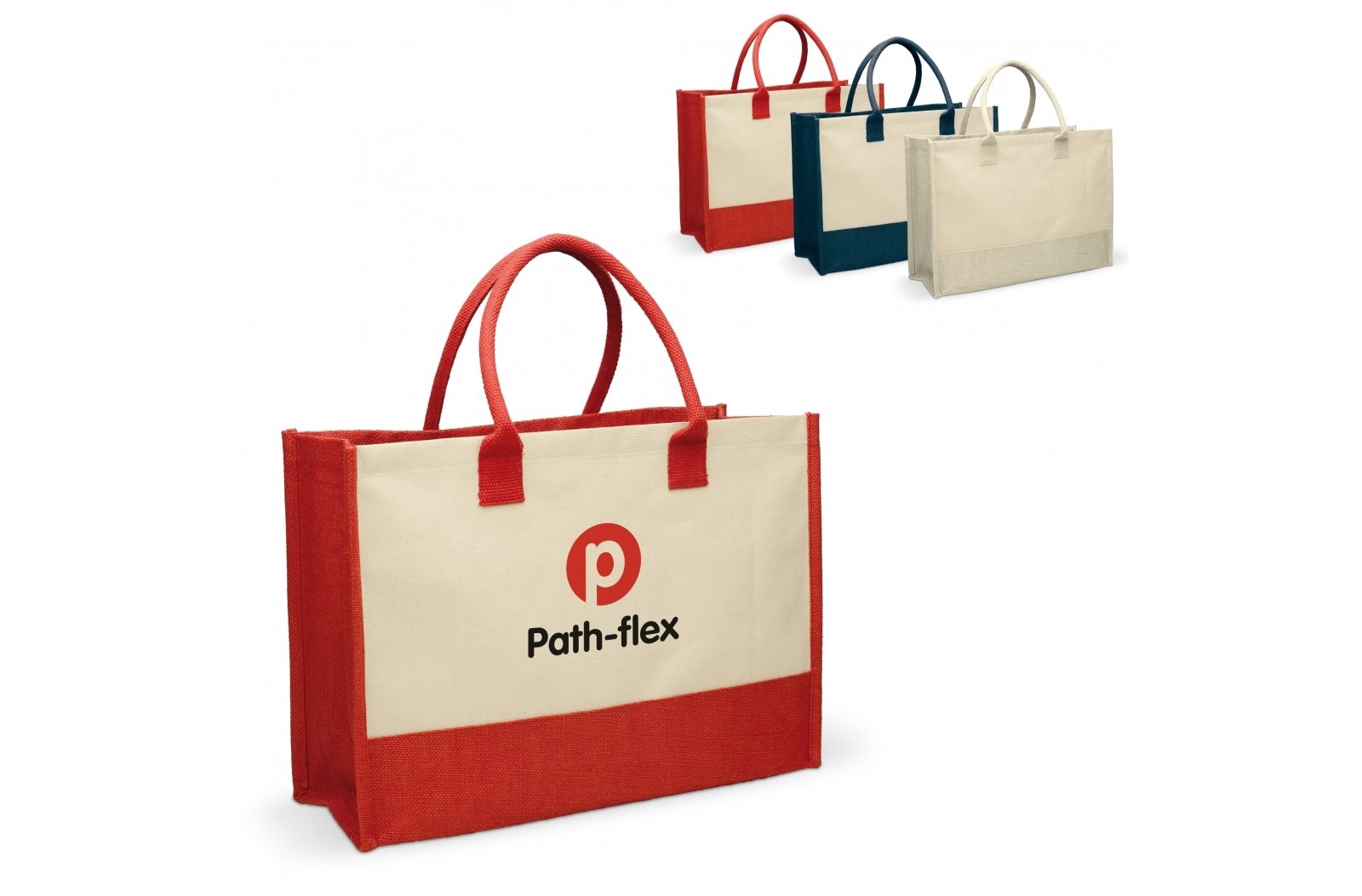 Solidna torba zakupowa zrobiona z materiału pomiędzy jutą a płótnem. Z uchwytami z bawełnianej liny.