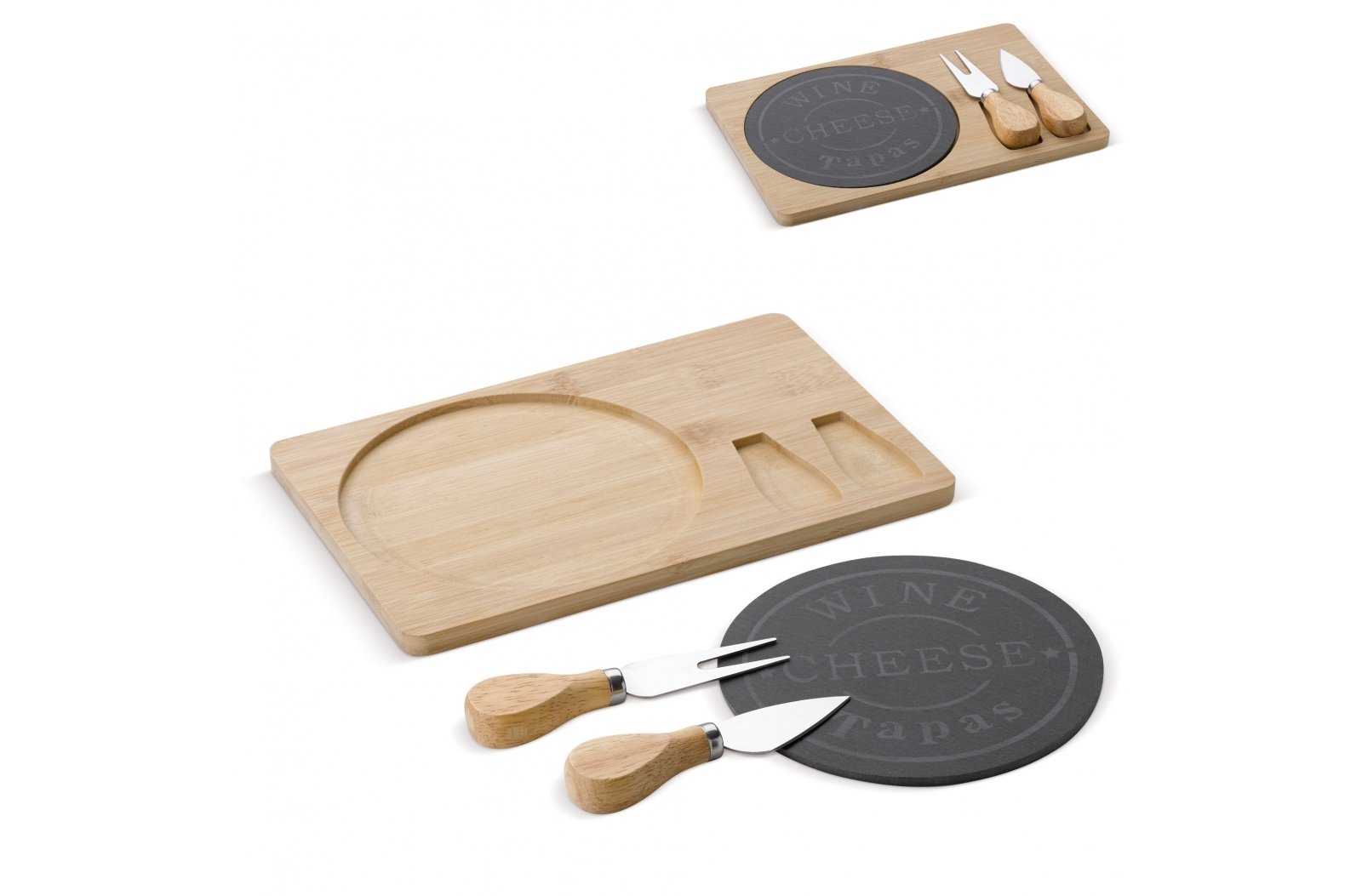 Bambusowy zestaw do serów zawiera talerz bambusowy i dwa różne noże ze stali nierdzewnej. Przyciągnie wzrok każdego, kto spojrzy na bufet. Jest wystarczająco duży, by zaprezentować kilka rodzajów tapas, przekąsek i serów.