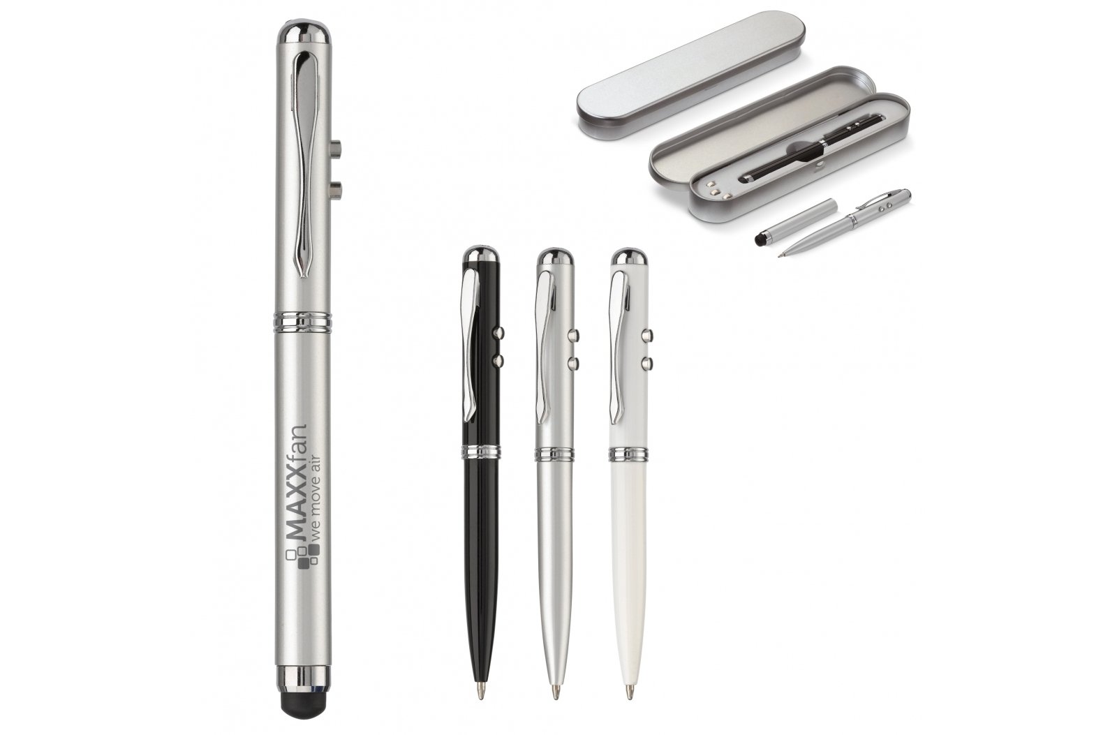 Metalowy długopis 4 w 1, ze wskaźnikiem laserowym i latarką. Dostarczany w pudełku z 3 bateriami. Niebieski wkład.