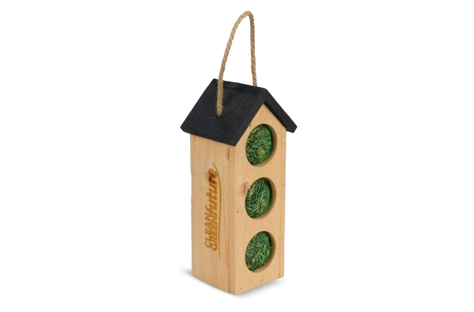 Karmnik ma nowoczesny wygląd ze względu na czarny dach. Zawieś go na gałęzi lub zaczep na linie na szczycie dachu. Trzy różne wejścia umożliwiają jednoczesne jedzenie kilku ptaków.