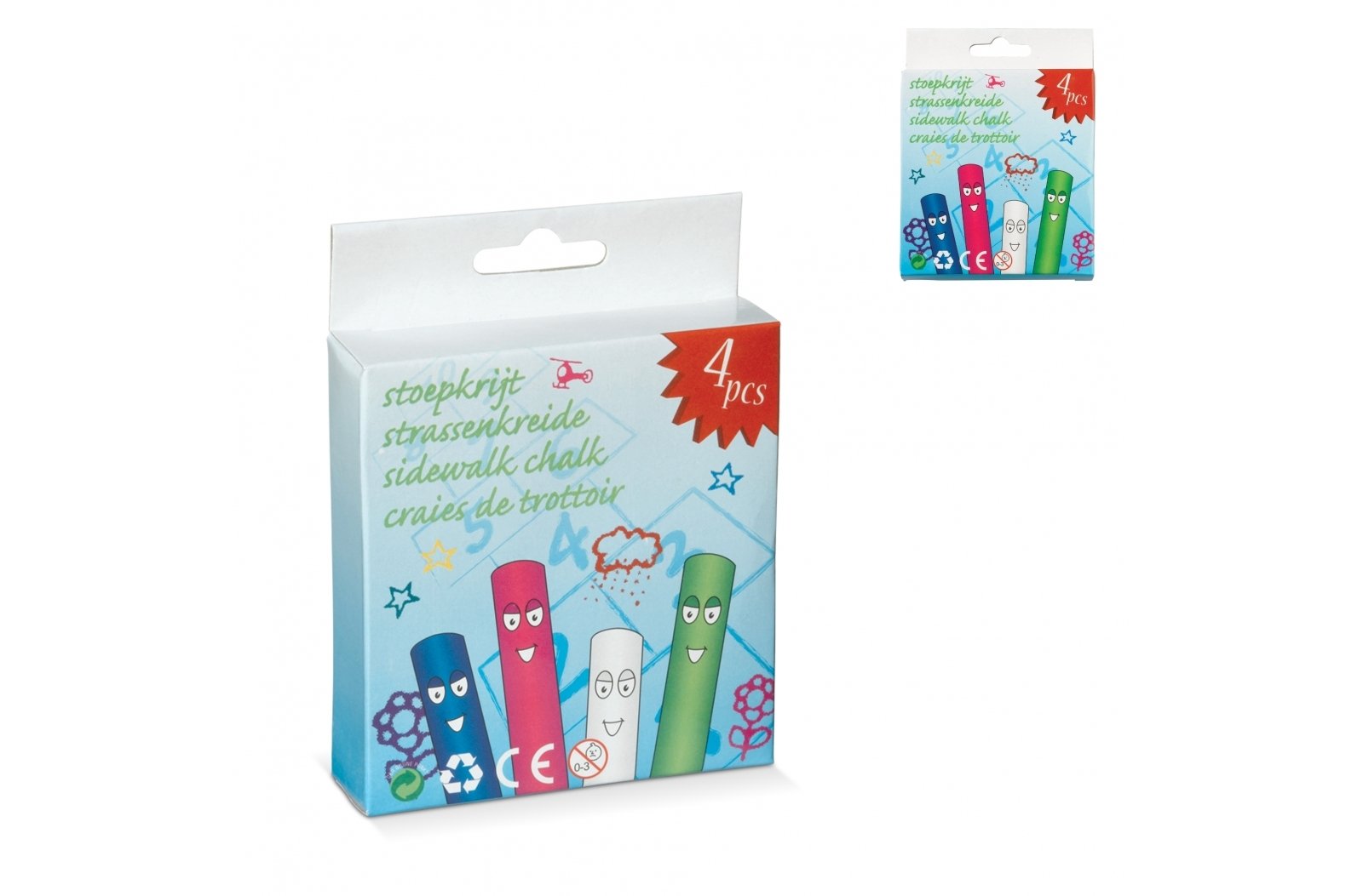 4 sztuki kredy w pudełku. Fajny upominek dla dzieci. Od 250 szt. możliwość wykonania swojego własnego pudełka.