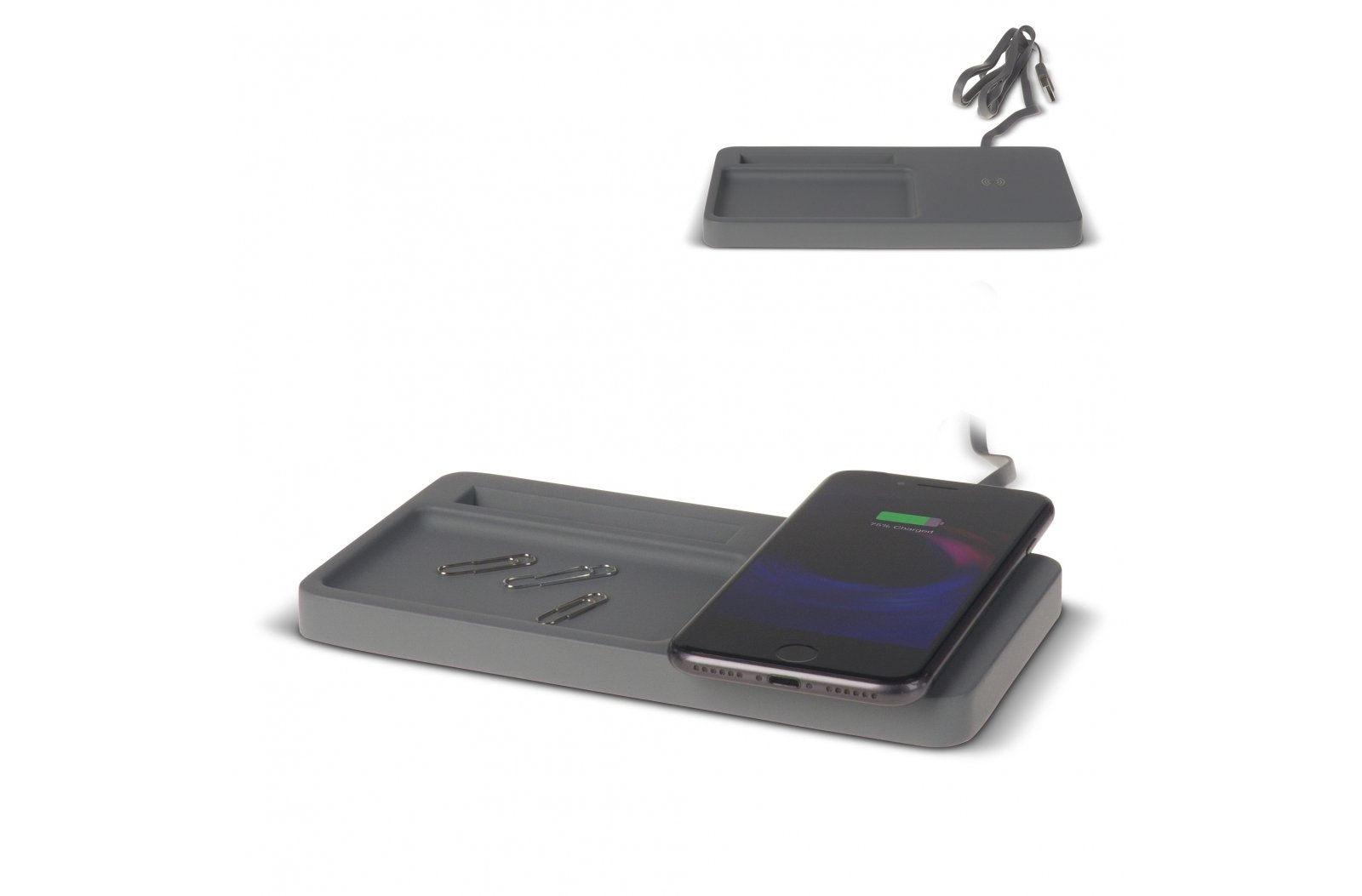 Organizer na biurko z wbudowaną ładowarką bezprzewodową. Urządzenia mobilne z funkcją ładowania bezprzewodowego mogą być ładowane przez cały czas. W zestawie podstawka na telefon i taca do przechowywania małych przedmiotów na biurku. Organizer wykonany jest z betonu wapiennego, co nadaje mu elegancki i stylowy wygląd. Dostarczany w pudełku upominkowym.