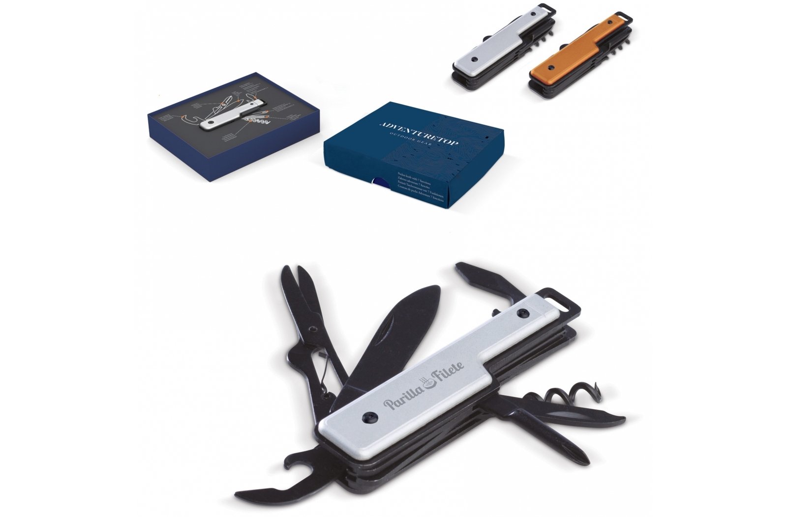 Produkt z kolekcji AdventureTop kieszonkowy scyzoryk, który posiada 7 funkcji (nóż, nożyczki, otwieracz do puszek, otwieracz do butelek, korkociąg, śrubokręt oraz pilnik) Produkt zapakowany w pudełko prezentowe.
