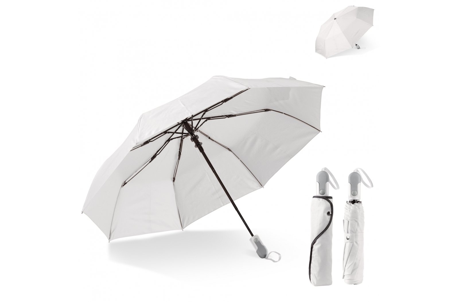 Piękna składana parasolka z ergonomicznie zaprojektowaną rączką i pokrowcem. Żebra parasolki wykonane zostały z włókna szklanego w celu zapewnienia jak najlepszej trwałości. Czarna rączka idealnie kontrastuje z białą czaszą.