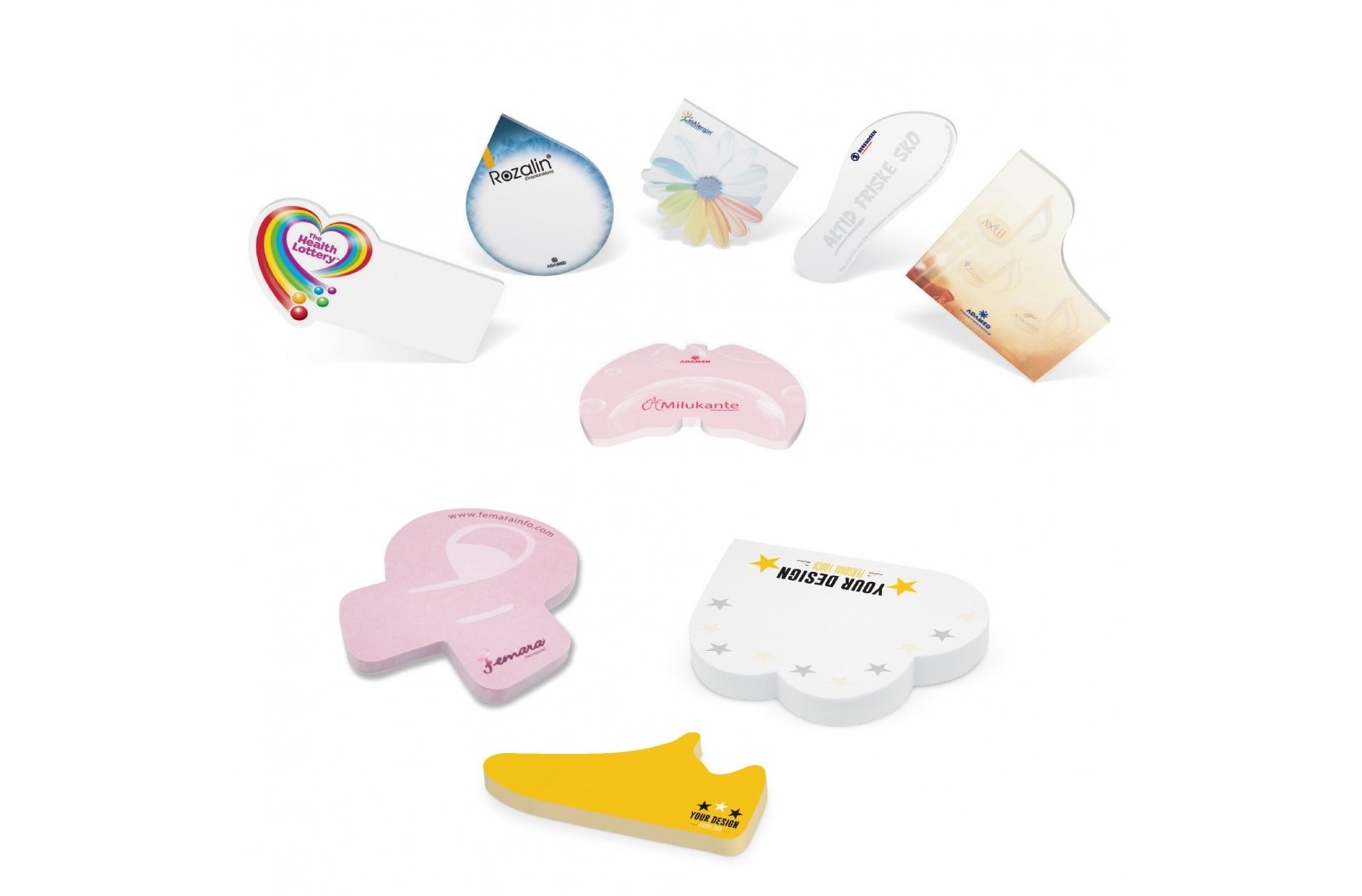 Utwórz własne karteczki samoprzylepne. Przy zamówieniach już od 5000 sztuk dostępnych jest ponad 50 różnych kształtów. Możliwy nadruk na każdej karteczce. Kolory pastelowe dostępne są bez dodatkowych kosztów, intensywne kolory za dopłatą.