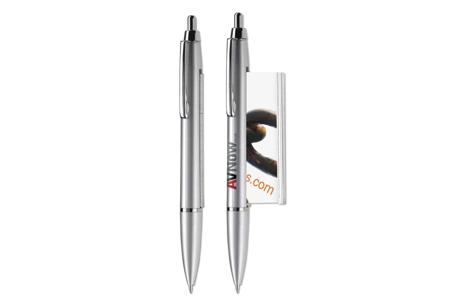 Wyjątkowy długopis wykonany ze srebrnego plastiku z wysuwanym banerem. Baner z nadrukiem full kolor na obu stronach. Idealny sposób na reklamę. Artukuł dostępny od 1.200 szt. Może być również dostarczony z nadrukiem na korpusie.