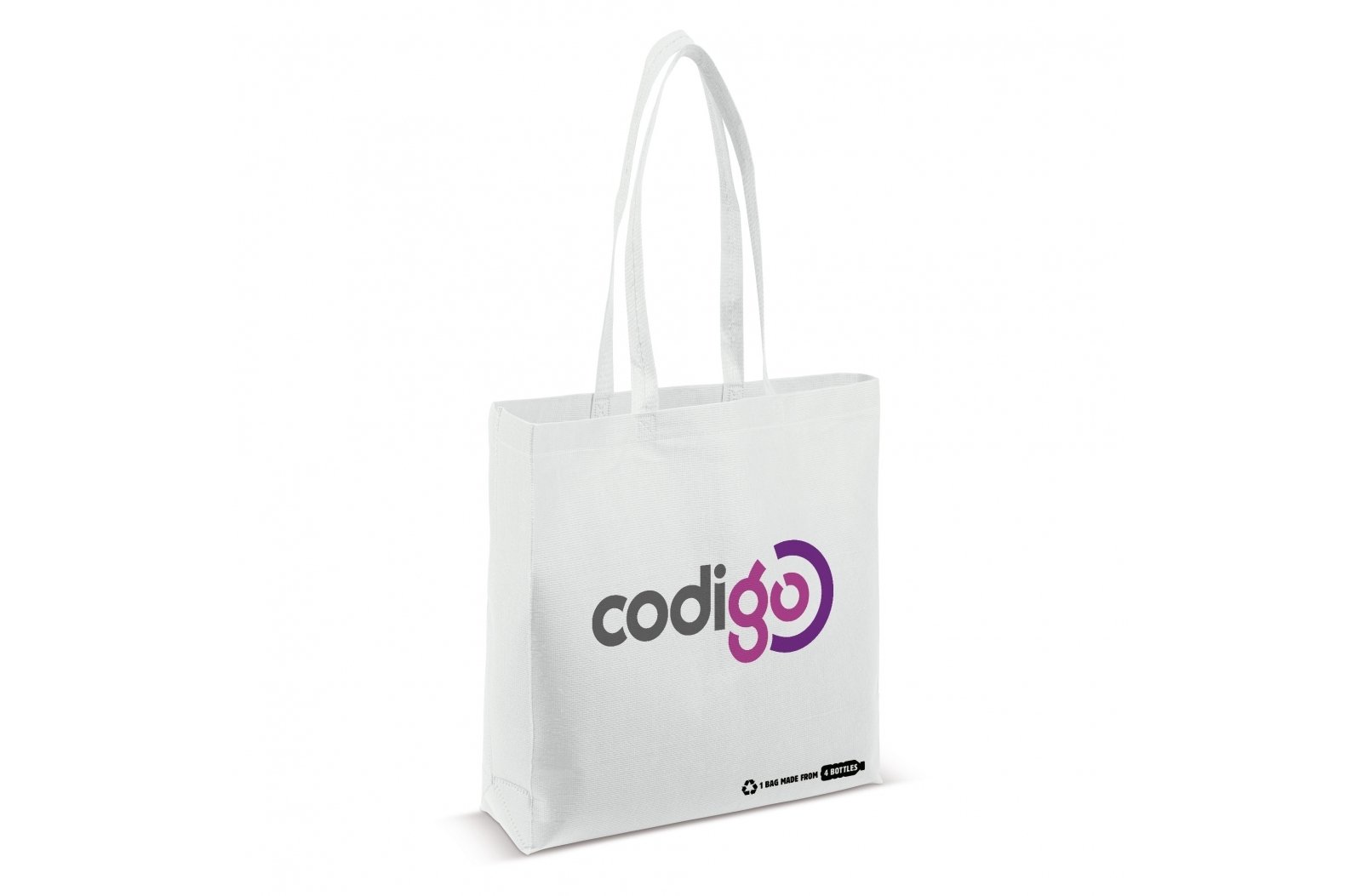 Torba wyprodukowana z czterech butelek PET pozyskanych z recyklingu. Dołącz do redukcji odpadów przy użyciu naszej torby wykonanej z materiałów odnawialnych.