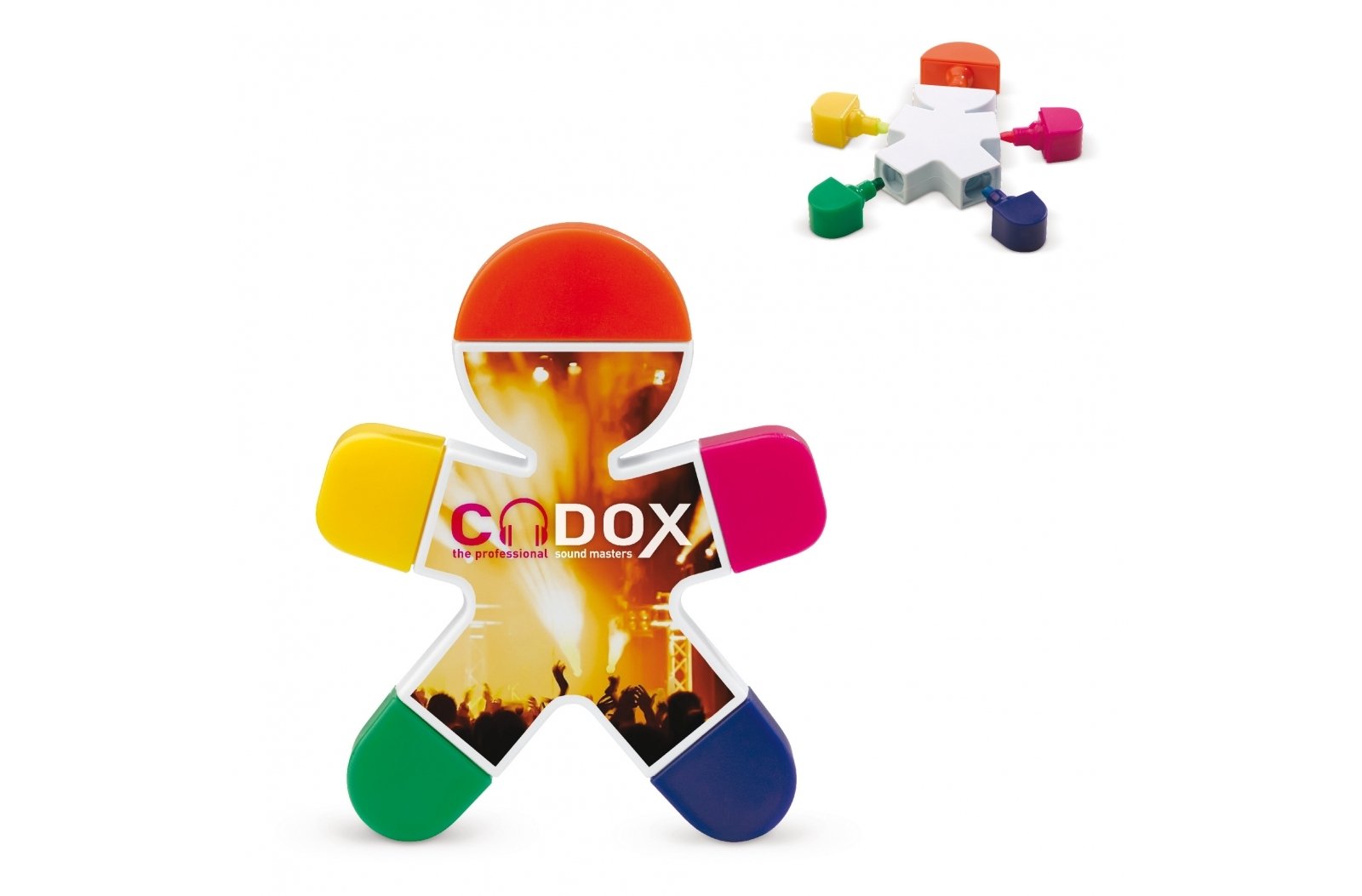 Figurka o kształcie mężczyzny z kolorowymi zakreślaczami. Nogi, ręce oraz głowa to zakreślacze które mogą zostać odłączone od figurki.