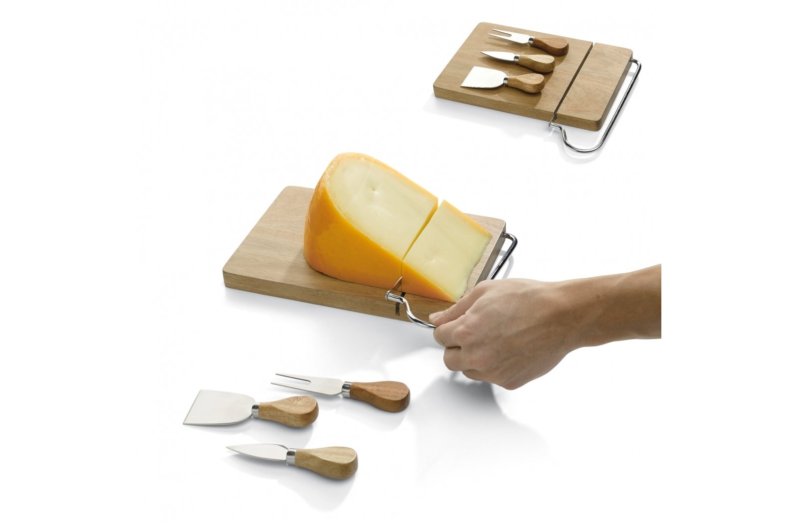Deska do serów z dwoma nożami i widelcem do serów. Zestaw zawiera również specjalny nóż do sera i jest wykonany z drewna akacjowego. Produkt pakowany w pudełko prezentowe.