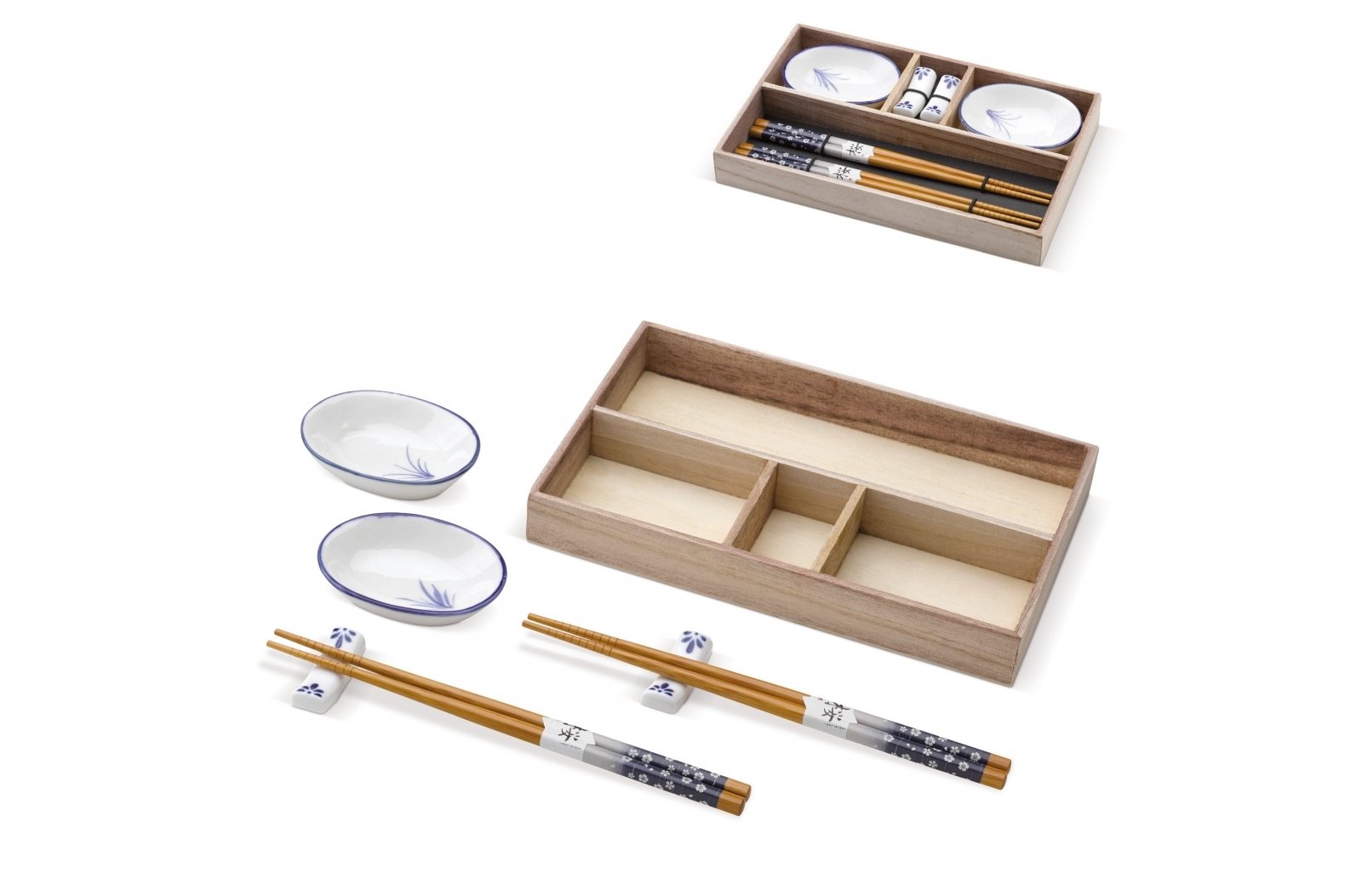 Zamawianie lub robienie sushi stało się bardzo popularne. Jeśli chcesz zaserwować sushi, które właśnie zamówiłeś/zrobiłeś, ten zestaw będzie bardzo pomocny. Posiada dwie pary pałeczek, dwie podpórki na pałeczki i dwie miseczki do sosu.
