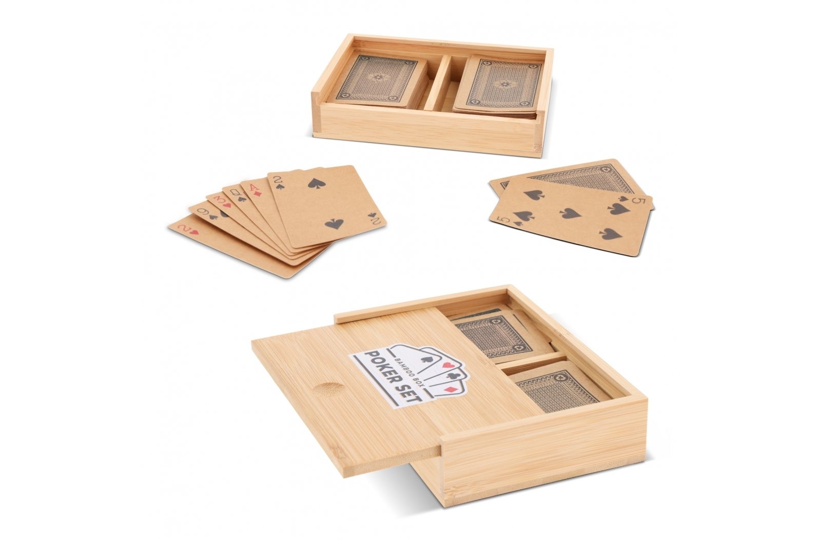 Bambusowe pudełko z 2 zestawami kart do gry. Z tym zestawem będziesz gotowy na każdy wieczór gier.